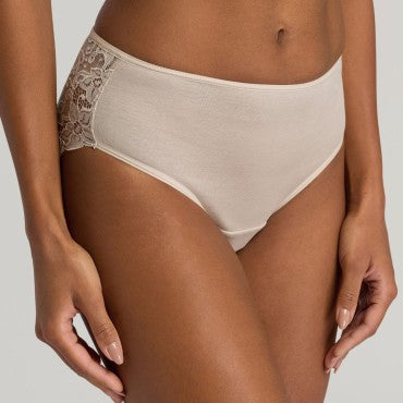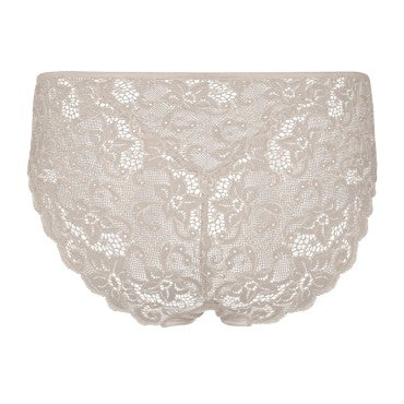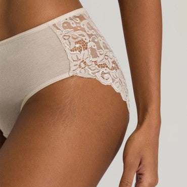 Italiensk trusse fra Hanros Moments serie. Moments serien er lavet i en blød og strækbar blonde, der smyger sig om kroppen. Den italienske trusse har mellem taljehøjde og seriens fine blonde bagpå og en blød bomuld foran.