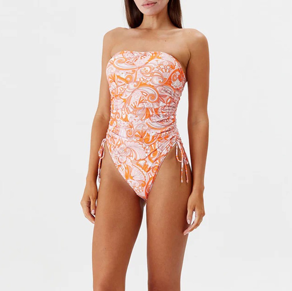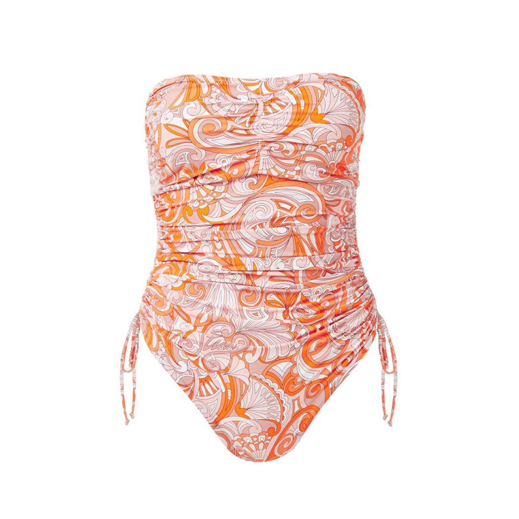 Stropløs Sydney badedragt fra Melissa Odabash. Badedragten er uden bøjle og har udtagelig vattering i skålene. Badedragten har justérbare snørrer ved benudskæringen og lette draperinger henover kroppen.