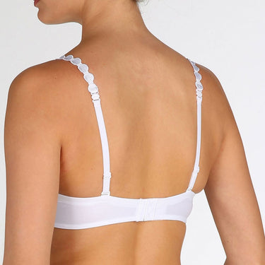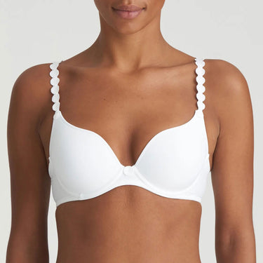 Bh med hjertefacon fra Marie Jos Tom serie. Bh'en er med bøjle og let vattering. Hjertefaconens buede kant lukker pænt til mellem barm og skål, og skålenes glatte overflade gør bh'en usynlig under selv tætsiddende tøj, hvilket gør den ideel som t-shirt bh. Stropperne kan indstilles til halterneck.